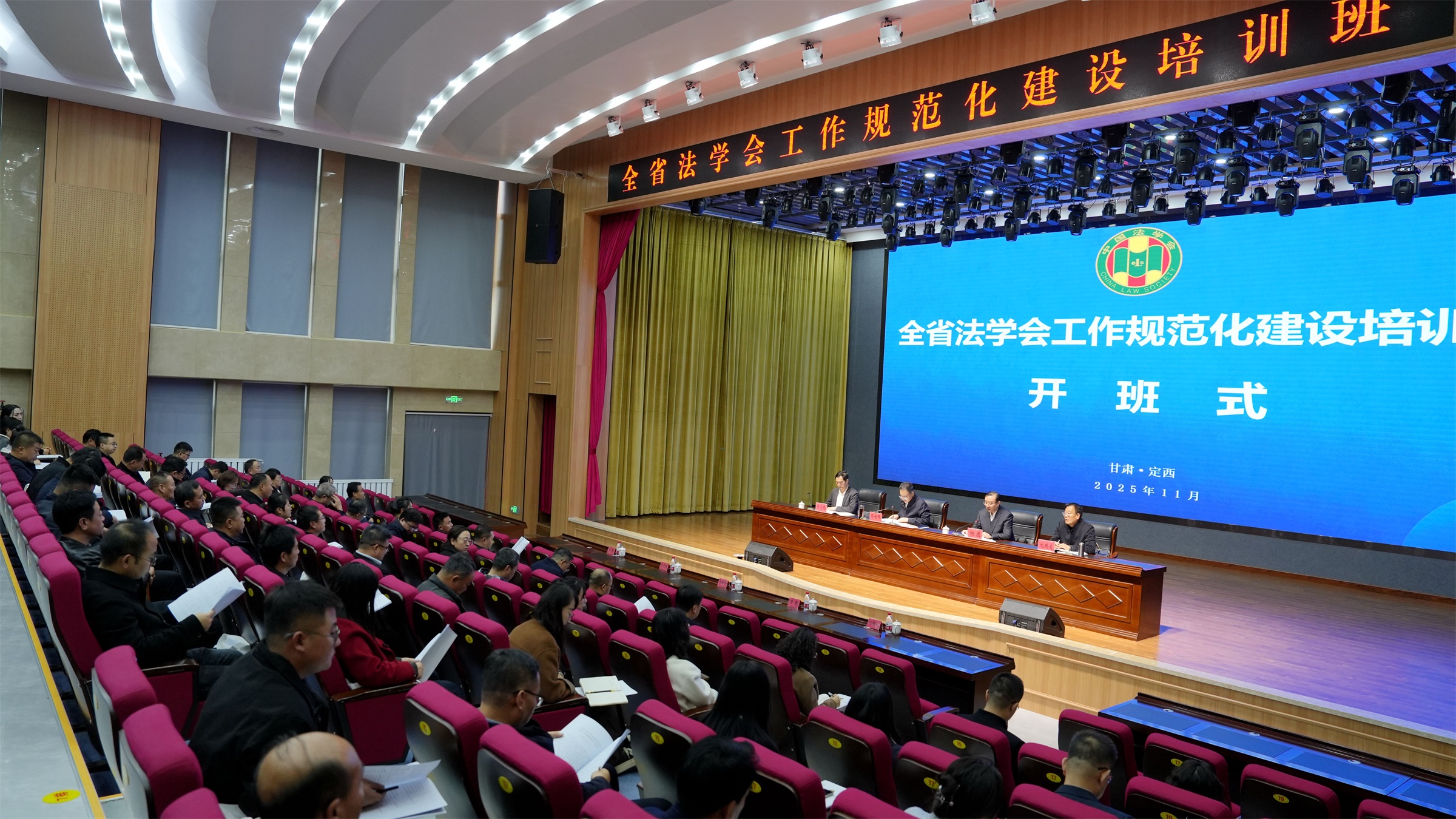 全省法学会工作规范化建设培训班11月5日至7日在定西市举办。坚持以习近平新时代中国特色社会主义思想为指导,深入学习贯彻习近平法治思想,学习贯彻党的二十届四中全会精神,重温学习习近平总书记给中国法学会第九次全国会员代表大会的重要致信和“九代会”精神,贯彻落实中国法学会、省委和省委政法委工作部署,全面提升全省法学会系统干部思想理论水平和依法履职能力,为谱写中国式现代化甘肃篇章创造安全稳定社会环境贡献智慧和力量。省法学会党组书记、常务副会长韩世峰主持开班式并讲话。