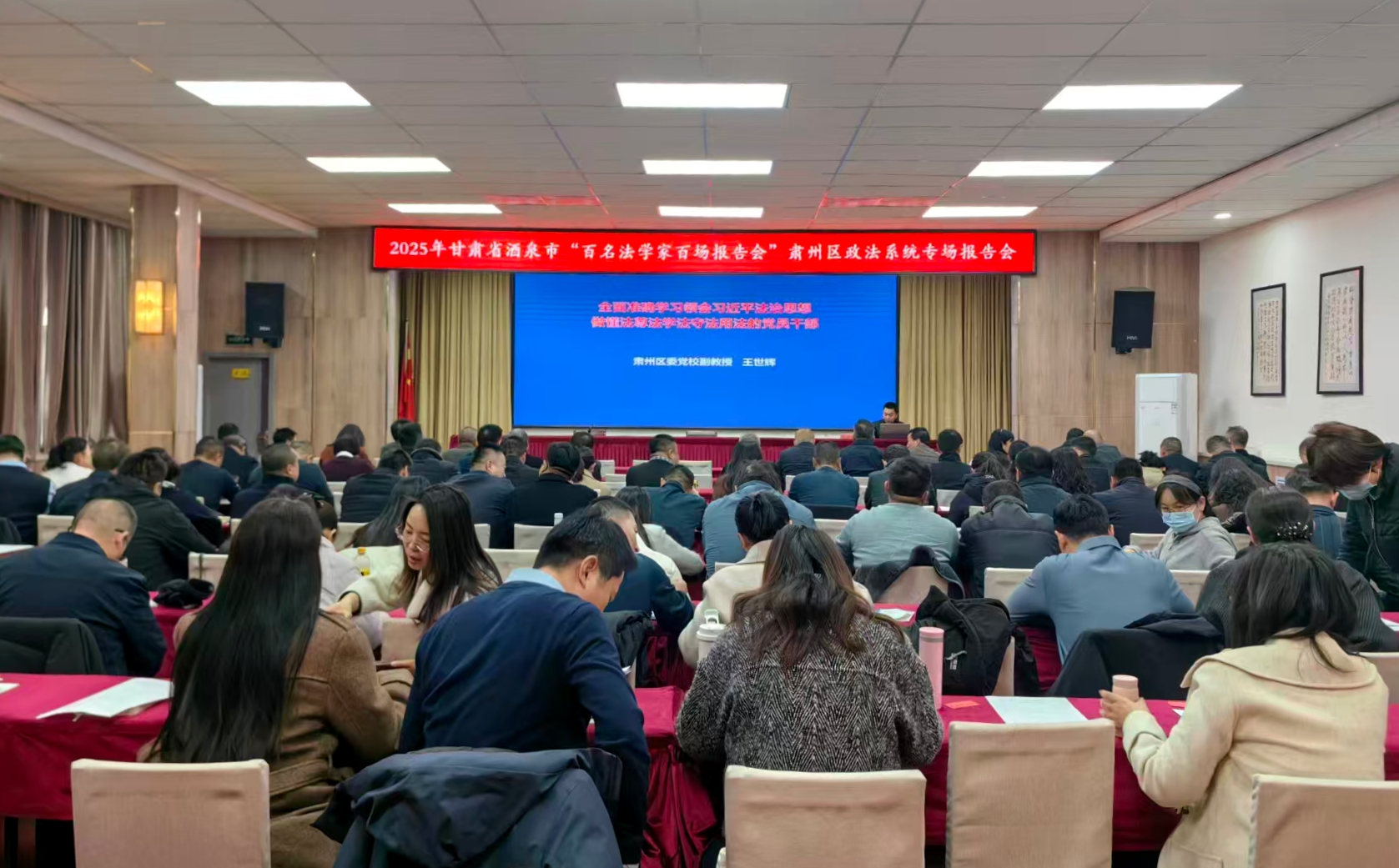 为深入学习贯彻党的二十届四中全会精神,进一步加强政法系统干部队伍思想政治建设,提升法治思维与履职能力,11月21日,甘肃省“百名法学家百场报告会”酒泉市肃州区政法系统专场报告会举行,邀请区委党校副教授王世辉作专题报告。区委常委、政法委书记、区法学会会长韩卫忠主持会议并讲话。区政府副区长、区公安分局局长张建武,区法院院长段利军,区检察院检察长吕玉琴出席会议。