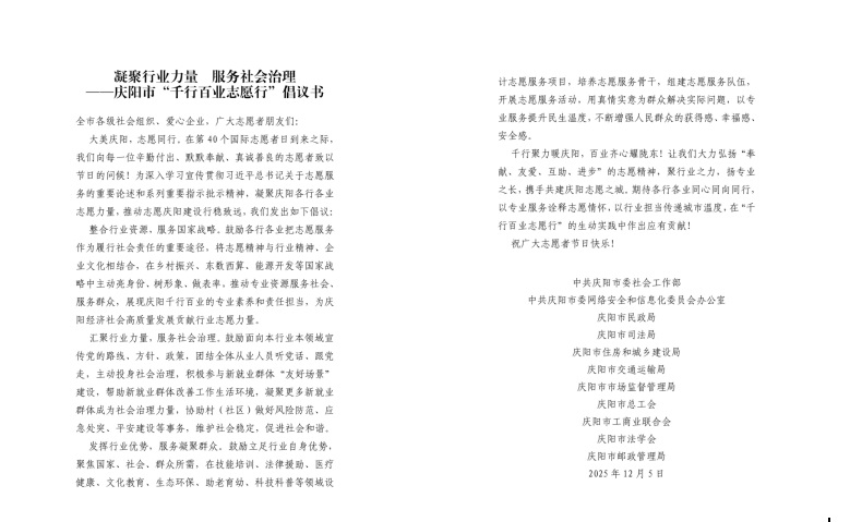 庆阳市“千行百业志愿行”倡议,各行各业把志愿服务作为履行社会责任的重要途径,将志愿精神与行业精神、企业文化相结合,整合行业资源,服务国家战略;汇聚行业力量,服务社会治理;发挥行业优势,服务凝聚群众,用真情实意为群众解决实际问题,以专业服务提升民生温度,不断增强人民群众的获得感、幸福感、安全感。