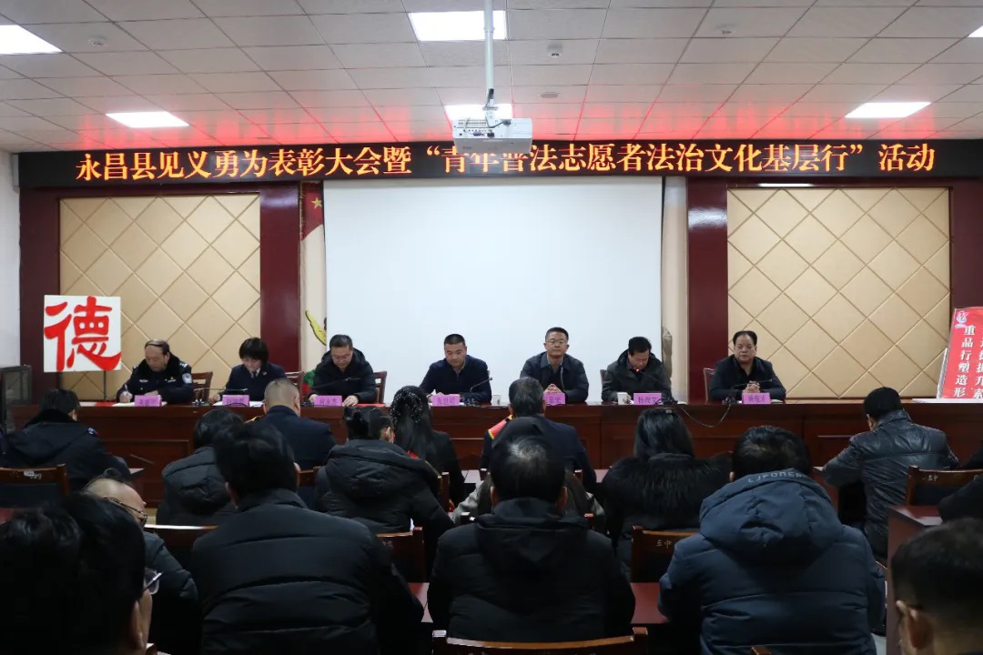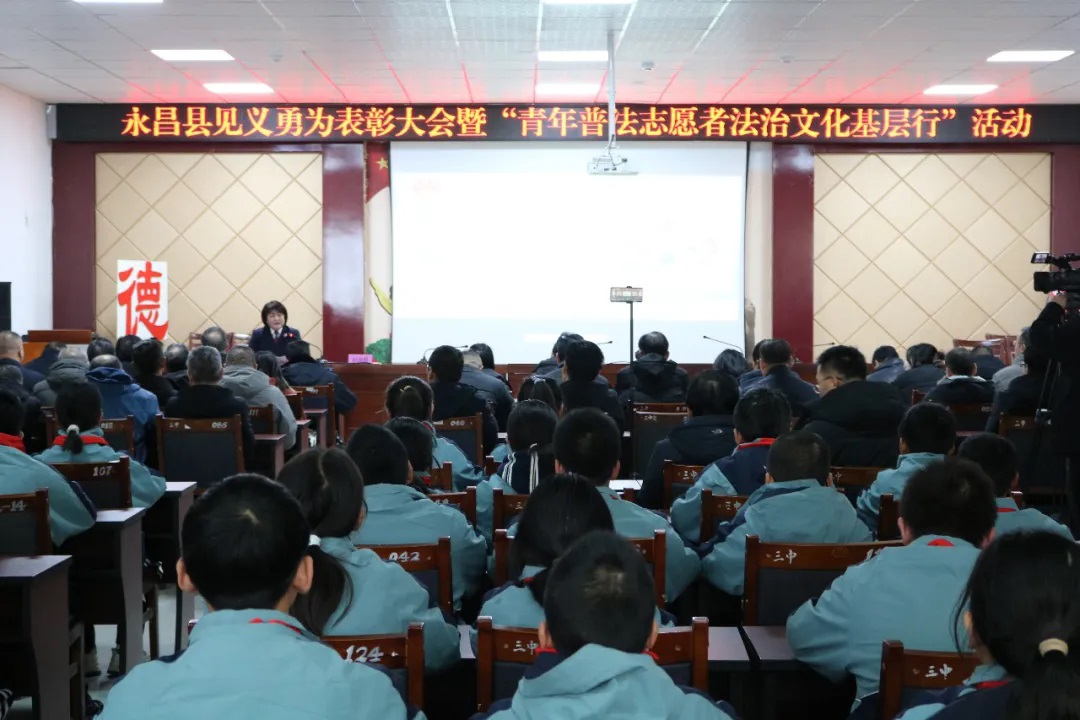 为弘扬见义勇为精神,筑牢校园法治安全防线,永昌县委政法委、县见义勇为协会、县法学会、县检察院、县教育局、朱王堡镇于12月31日在永昌县第三中学举办永昌县见义勇为表彰大会暨“青年普法志愿者法治文化基层行”活动。